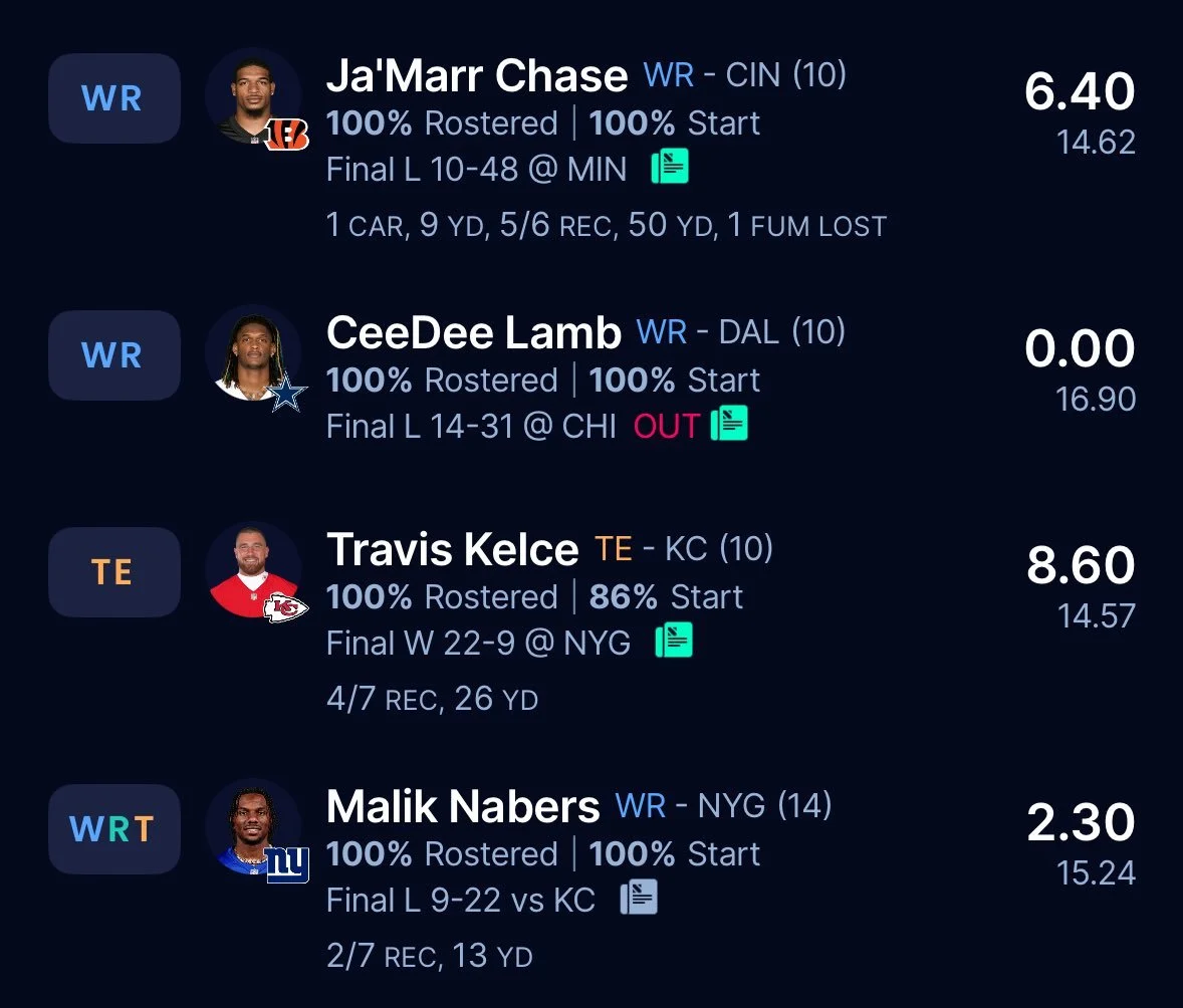 It’s like Malcolm Gladwell’s 10,000 hours theory in reverse. I feel like I’m actively getting dumber with each lineup decision. Case in point—why did I draft (and actively continue to roster) Kaleb Johnson, who’s sitting at –0.1 fantasy points? I’ve literally outscored him.