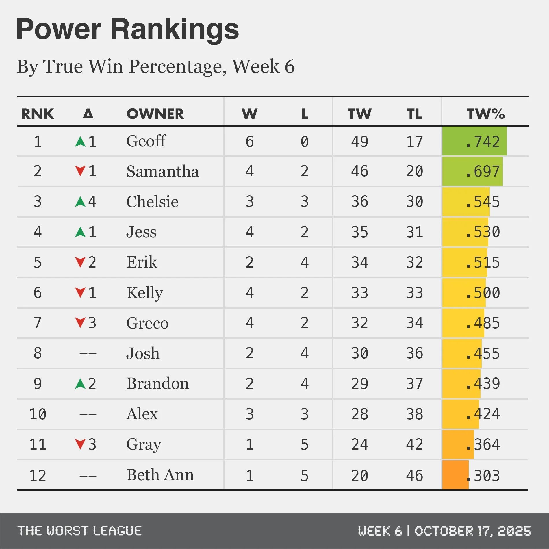 Greco is 4-2, but trending down. She’s had three subpar outings in the last four weeks and ranks just 10th in TW% during that time. Injuries could turn this from a slump into a slide: Bucky Irving, Chuba Hubbard, Aaron Jones, Terry McLaurin, and David Njoku could all miss Week 7. Her next four opponents? Jess, Kelly, Erik, and Geoff—all teams above her in the Rankings. Not all 4-2 teams are created equal, and this one is looking the most suspect.