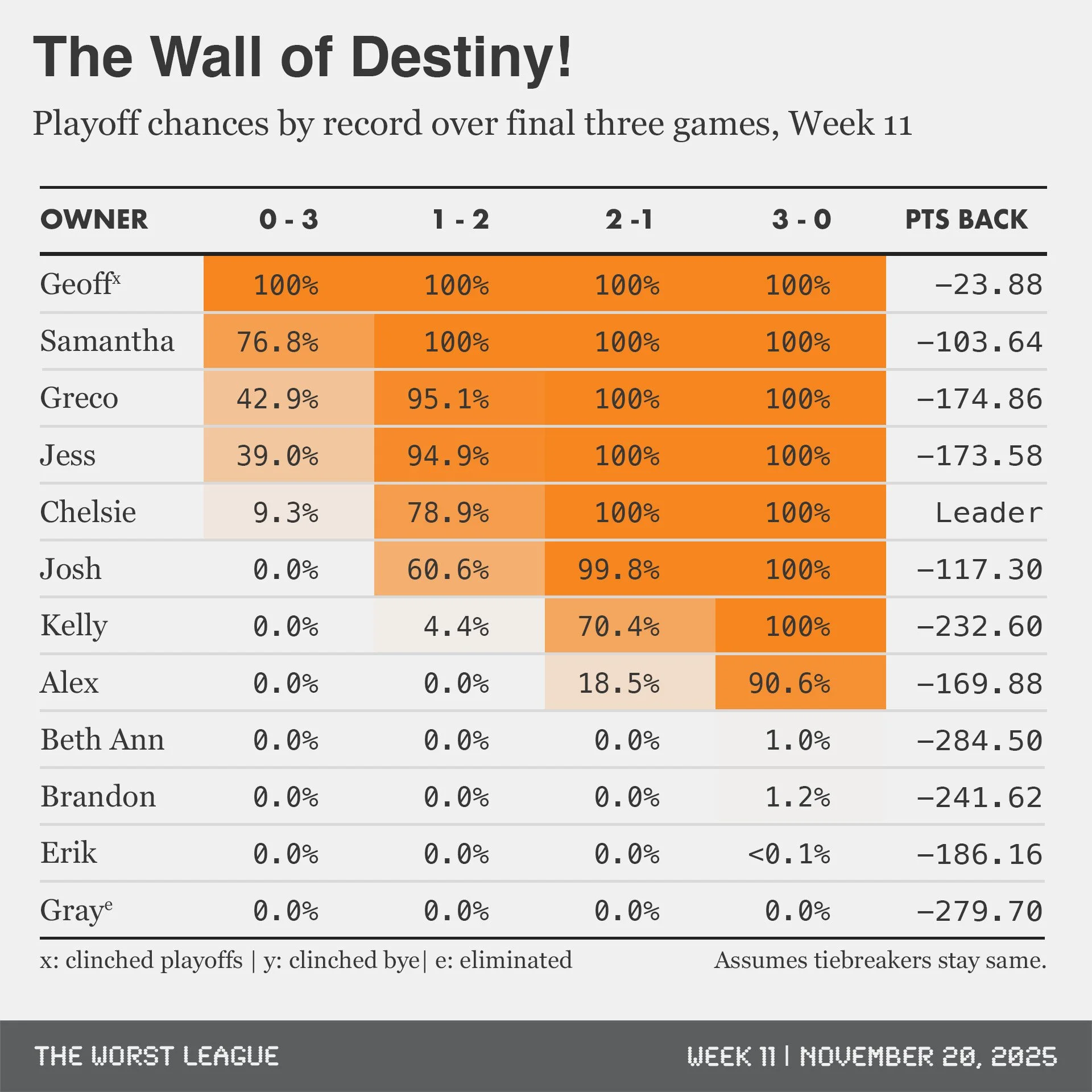 Chelsie needs two wins to clinch, but thanks to her points lead, even one probably (79%) gets her there. With Gray and Brandon in Weeks 13 and 14, she’s in good shape. But this week’s matchup with Josh is massive. Both are 6–5, and the Wall says they can each only afford one loss the rest of the way without a drop in playoff odds. Meaning: whoever loses this week comes out of it with their back firmly against the wall.