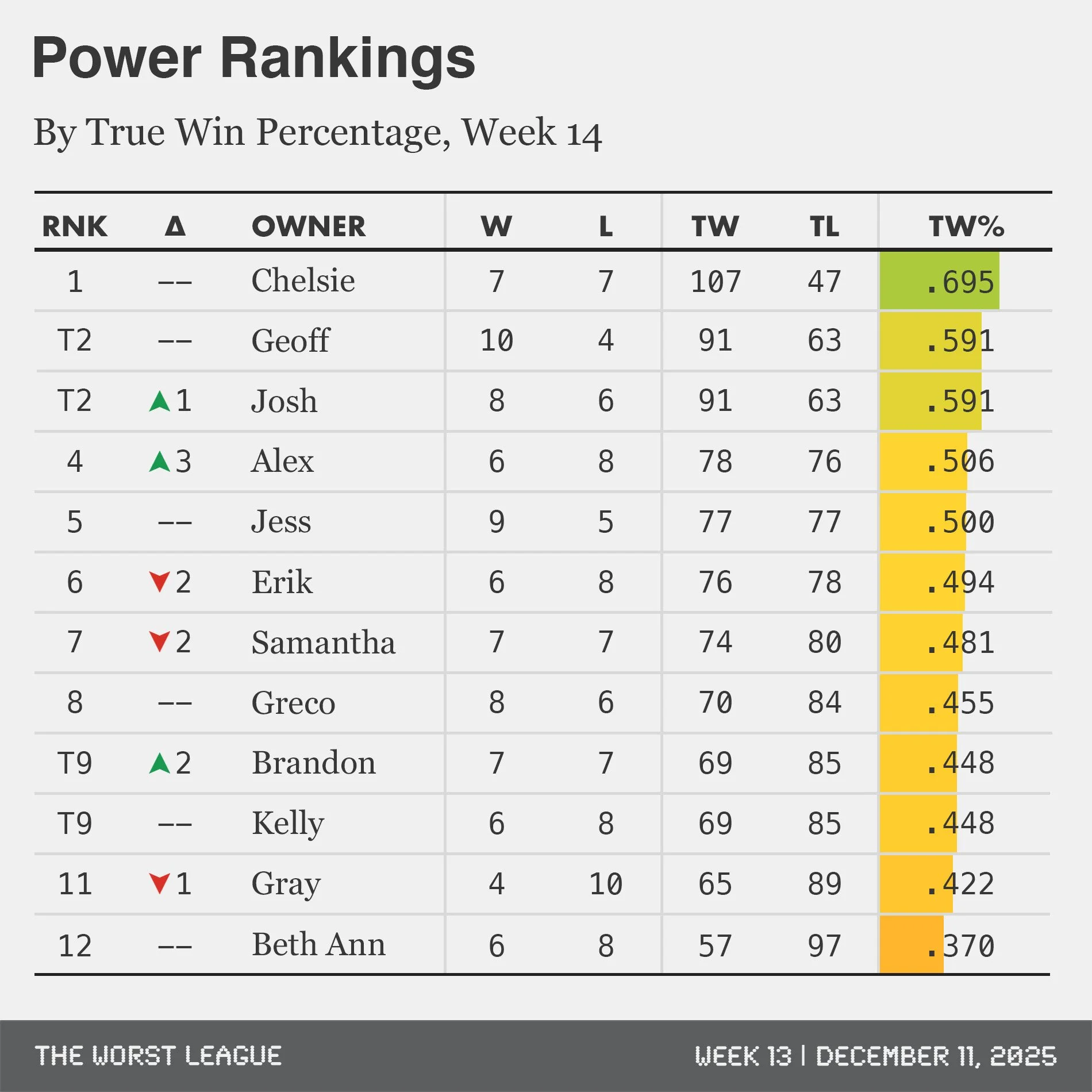 She may have taken an L in Week 14 to finish 7-7, but don’t let the record fool you. This is a great team who was the unfortunate victim of multiple unlucky losses. She now joins this illustrious list of former Power Rankings champs, listed here along with how they finished: